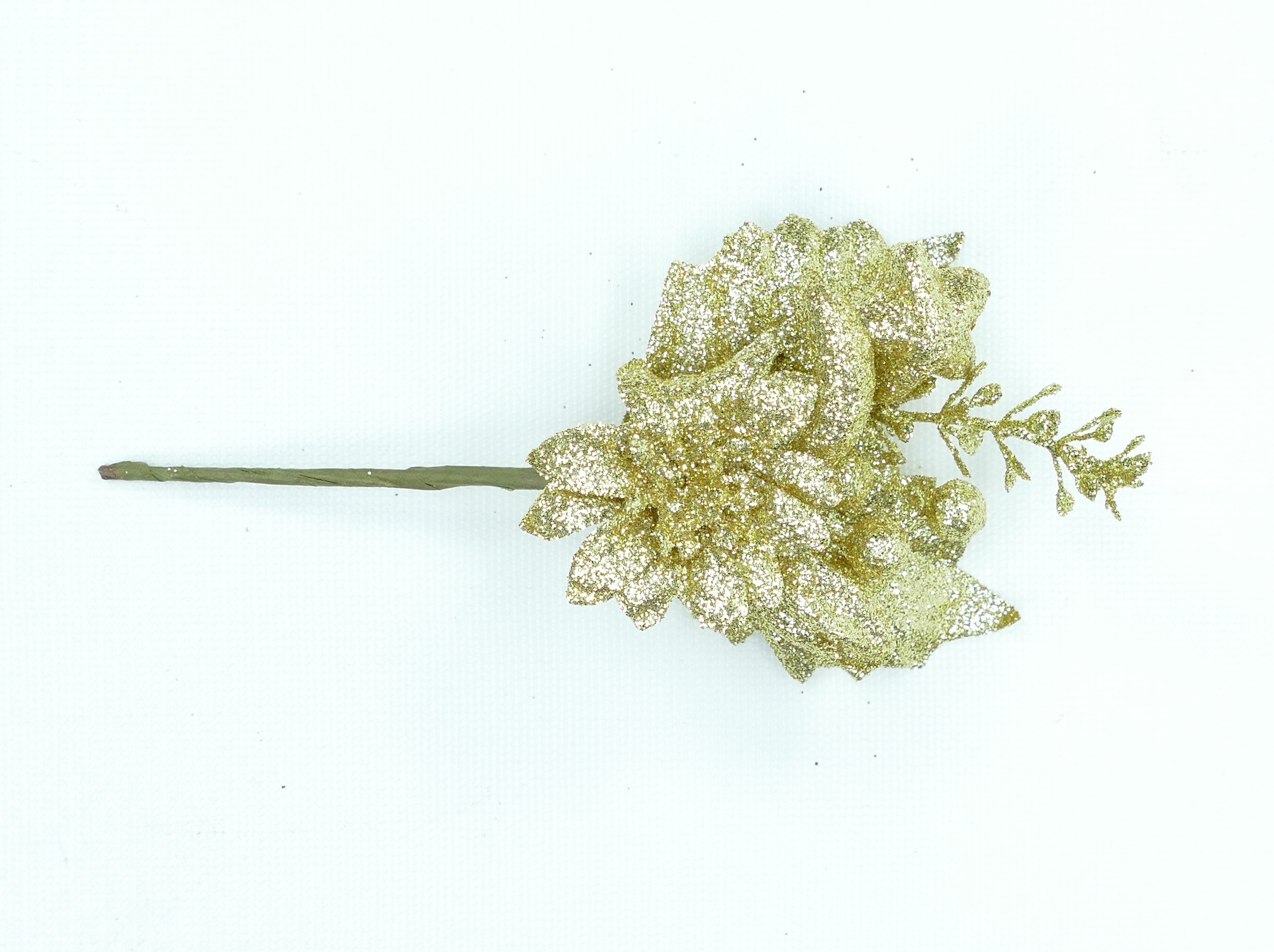 DESCRIPTION – Gold glittered wreath pick with 2 holly leaves, a poinsettia, fruit and berries, a star and foliage sprig. Overall length is 6.5 inches with a 3 inch stem. Minimum order is 12 picks. Made in China.